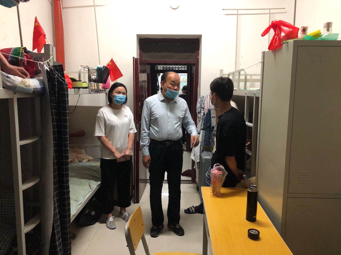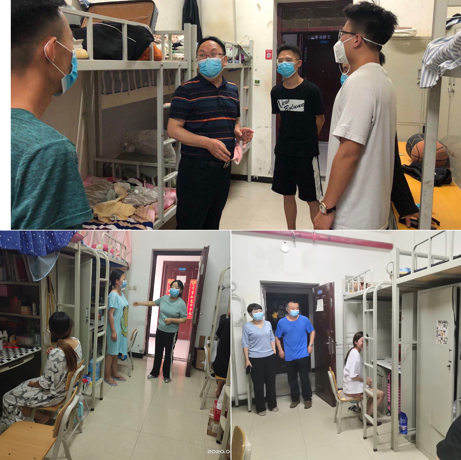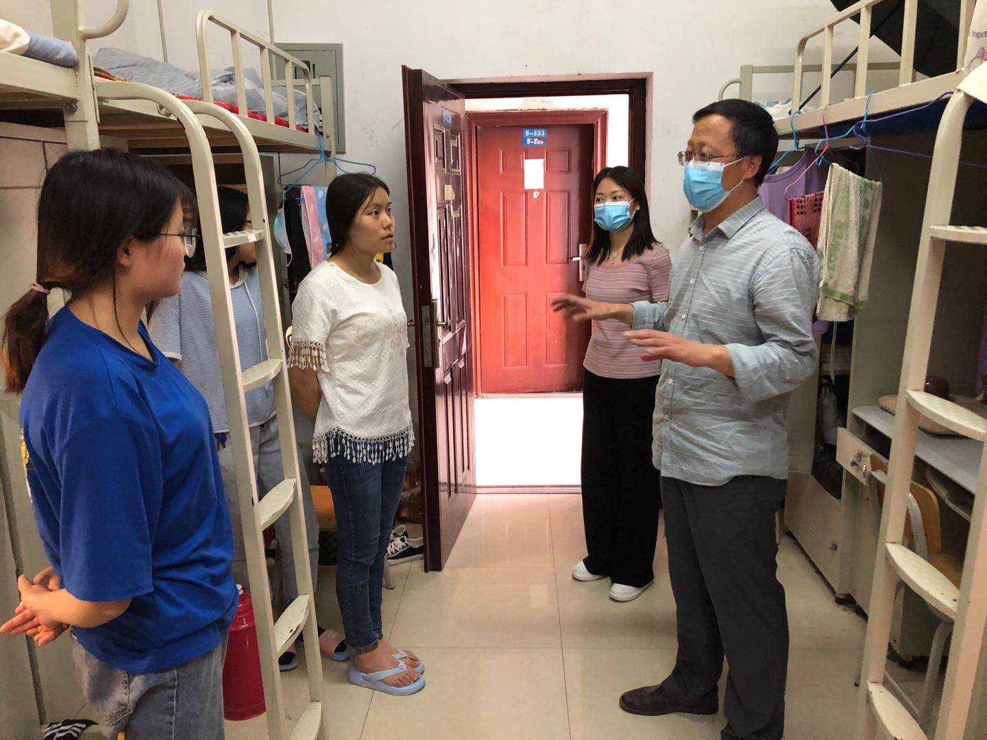 5月17日晚,今年会jinnianhuicom党总支书记卢百龙、院长郭楚伟、副院长李有成、副书记黄翠萍、学生科科长陈旭铖、办公室主任李新萍前往学生宿舍楼看望返校学生并检查宿舍防疫工作。