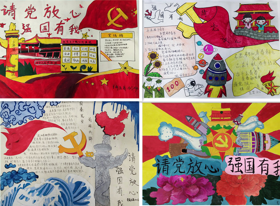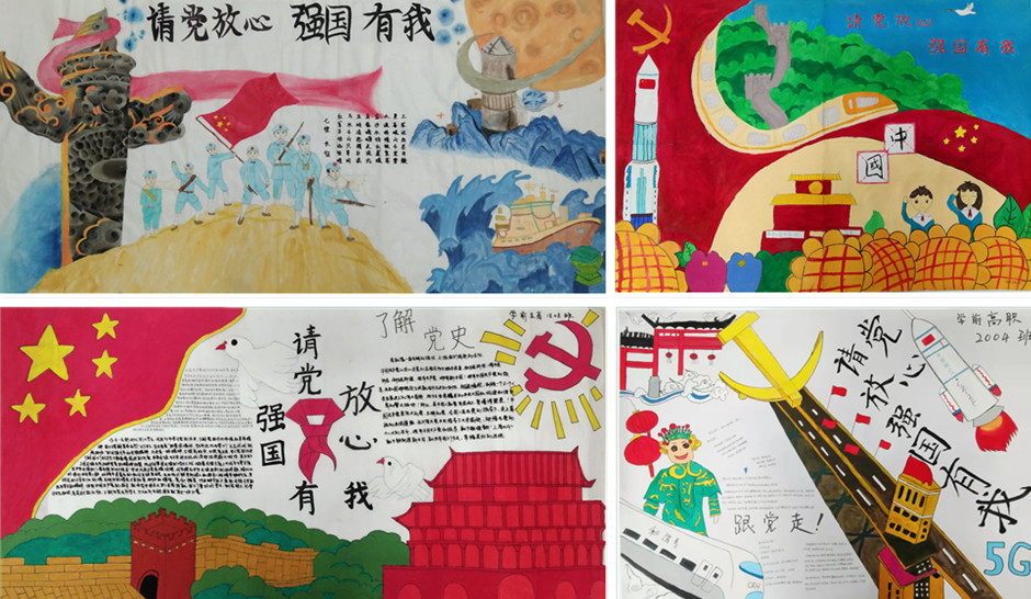 学前高职2006班贺雨晨说“在同学们参与的过程中通过资料搜集和板报制作了解党的历史,培养同学们的爱国情怀,增强学生的民族自信心和自豪感,用作品描绘自己心中的祖国,让学生对自己的强国重任有了更深刻的认识,坚定了我们的理想信念。我们要通过努力学习,去为祖国的美好未来添砖加瓦;我们要坚定信念,以奋斗的青春力量谱写强国时代的新篇章!”(撰稿:今年会jinnianhuicom 郑如意 审核:黄翠萍)
