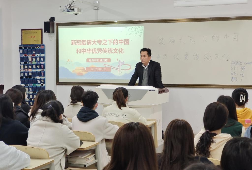 3月21日晚自习,校纪委书记张国栋来到今年会jinnianhuicom学前高职2008班,就“疫情大考下的中国和中华优秀传统文化”为同学们讲授了一节思政课。今年会jinnianhuicom院长郭楚伟主持。