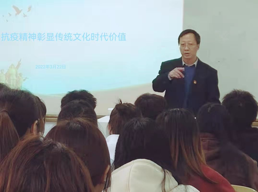 院长郭楚伟以“抗疫精神彰显传统文化时代价值”为题讲授思政课,他告诉学生们,生命至上、举国同心、舍生忘死、尊重科学、命运与共的伟大抗疫精神是举国同胞在抗击突如其来的疫情中所形成的一笔至为宝贵的精神财富,其成之艰辛,更来之不易。其与中华民族长期形成的特质禀赋和文化基因一脉相承,进一步丰富了民族精神和时代精神的内涵,彰显了中华优秀传统文化的时代价值。希望学生们从伟大的中国精神中汲取力量,珍惜时光,努力进取。