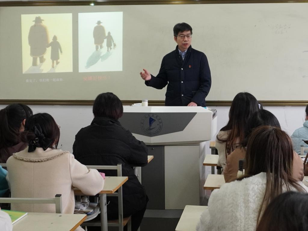 课间,靳华锋与授课教师和学生进行了亲切交流,给学生送上新学期新祝福。他鼓励同学们要树立远大理想,增强人生信念,努力学习知识技能,争做新时代合格的幼儿教师;希望老师在绘本导读教学中充分挖掘中华优秀传统文化资源,传播中华优秀文化,讲好中国故事。靳华锋并且嘱咐同学们,在春季传染病高发季节要做好个人防护,做自己健康的守护者,以更好的状态投入到新学期的学习生活中去。