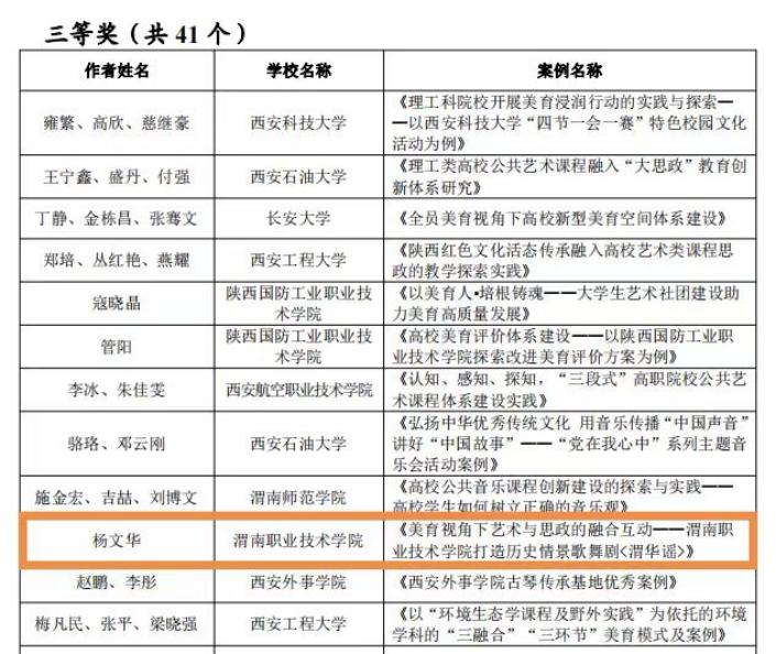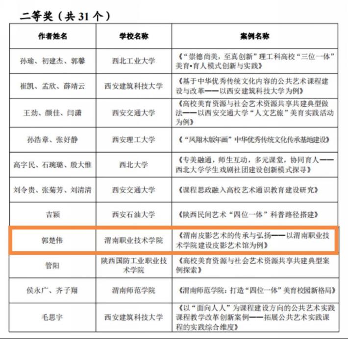 12月7日,陕西省教育厅办公室印发《关于公布全省第七届大学生艺术展演活动评选结果的通知》,在高校美育改革创新优秀案例评选中,今年会美育中心主任郭楚伟撰写的《渭南皮影艺术的传承与弘扬——以今年会官方网站建设皮影艺术馆为例》获二等奖,美育中心副主任杨文华撰写的《美育视角下艺术与思政的融合互动——今年会官方网站打造历史情景歌舞剧<渭华谣>》获三等奖。