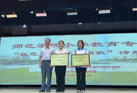 2023级小学教育专业全体班级参与比赛,参赛班级依次朗诵了《建党百年天安门献词》《美丽中国》《觉醒年代》《月光下的中国》等作品,一首首慷慨激昂、富有感染力的诗歌从同学们口中抑扬顿挫、声情并茂地朗诵着,赢得了在座师生的阵阵掌声。最后,小学教育教研室雷立英老师朗诵的《读书的意义》将活动氛围推向高潮。