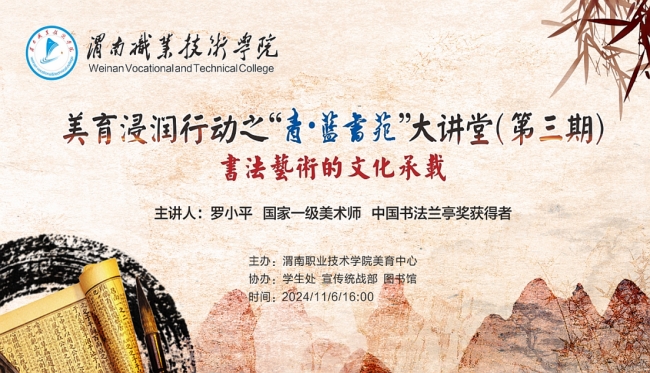 11月6日下午,美育中心在综合楼举办书法艺术专题讲座,国家一级美术师,第四、七、八届中国书法兰亭奖获得者,我院美育中心副主任罗小平为书画艺术专业学生和书法爱好者作了“书法艺术的文化承载”专题辅导。美育中心副主任杨文华主持。