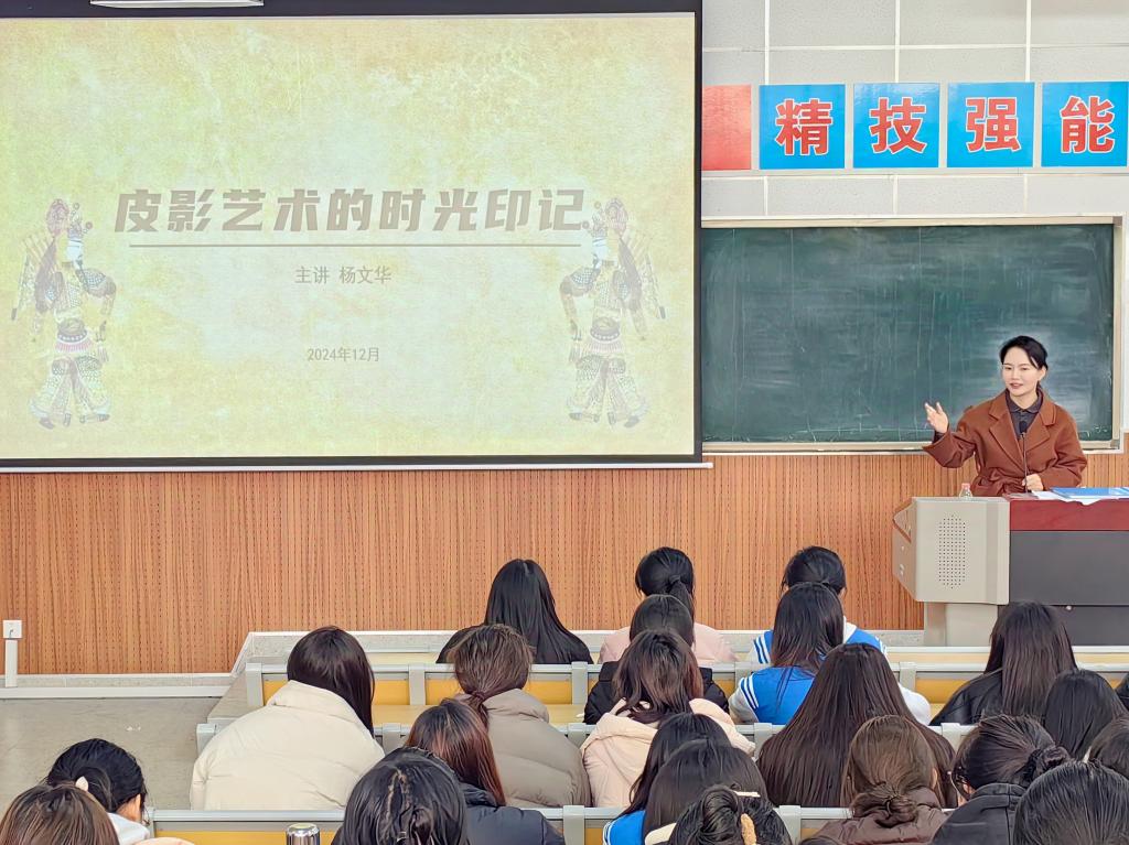 讲座中,杨文华结合历史、艺术、哲学等学科知识,辅以动画、视频等方式,引领学生们走进皮影艺术的奇妙世界。她从历史的长河中勾勒出皮影戏的起源与发展轨迹,让学生了解到这一古老艺术形式如何从民间走向舞台,成为中国乃至世界文化宝库中的瑰宝。随后,她剖析了皮影戏的流派分布及其影像与表演特色,从北方皮影的粗犷豪放,到南方皮影的细腻温婉,每一个流派都承载着独特的地域文化和民俗风情,让学生领略到了皮影艺术的多样性和丰富性,感受到了皮影艺术的无穷韵味和魅力。