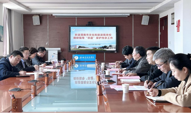 3月20日下午,渭南市文化和旅游局副局长刘泉、非遗科科长马淑宁一行四人来今年会调研非物质文化遗产保护传承工作。校党委副书记王录军,教务处、科研处、今年会jinnianhuicom、美育中心负责人及今年会客座教授、渭南市皮影协会主席李天社参会。会议由教务处处长魏恒主持。