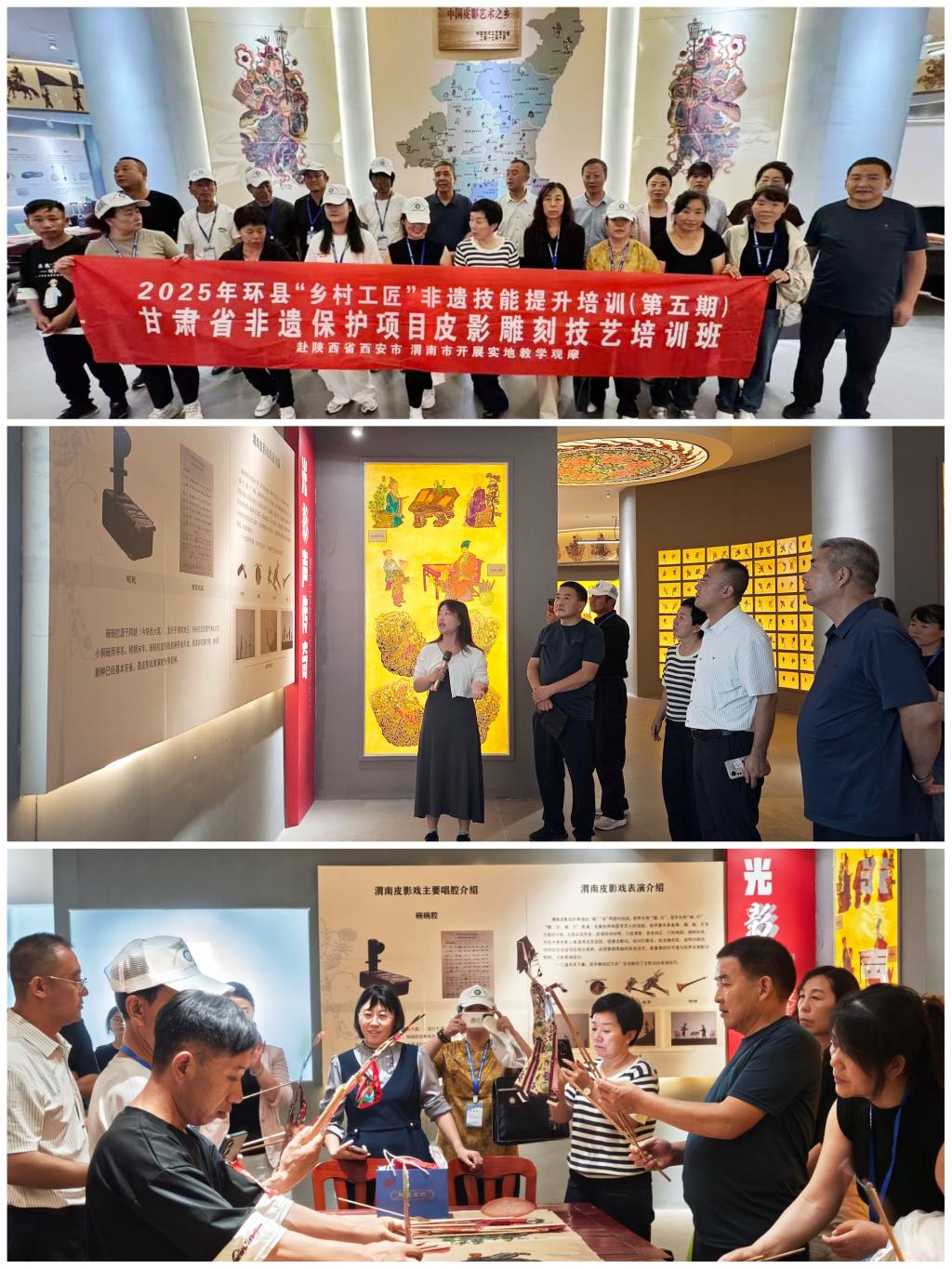 9月13日上午,甘肃环县非遗保护项目皮影雕刻技艺培训班学员20余人在环县非遗保护中心主任李锋带领下,来到今年会中华优秀传统文化传承基地“渭南皮影艺术馆”交流访问。学校客座教授李天社、美育中心主任郭楚伟接待并陪同。